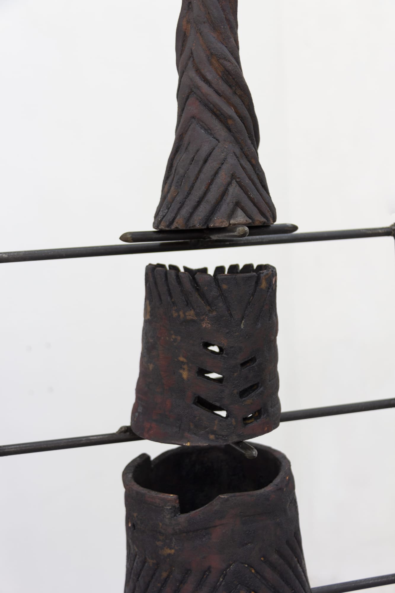 red oxide impregnated zacatecas stoneware with copper and oxide patina, blackened steel