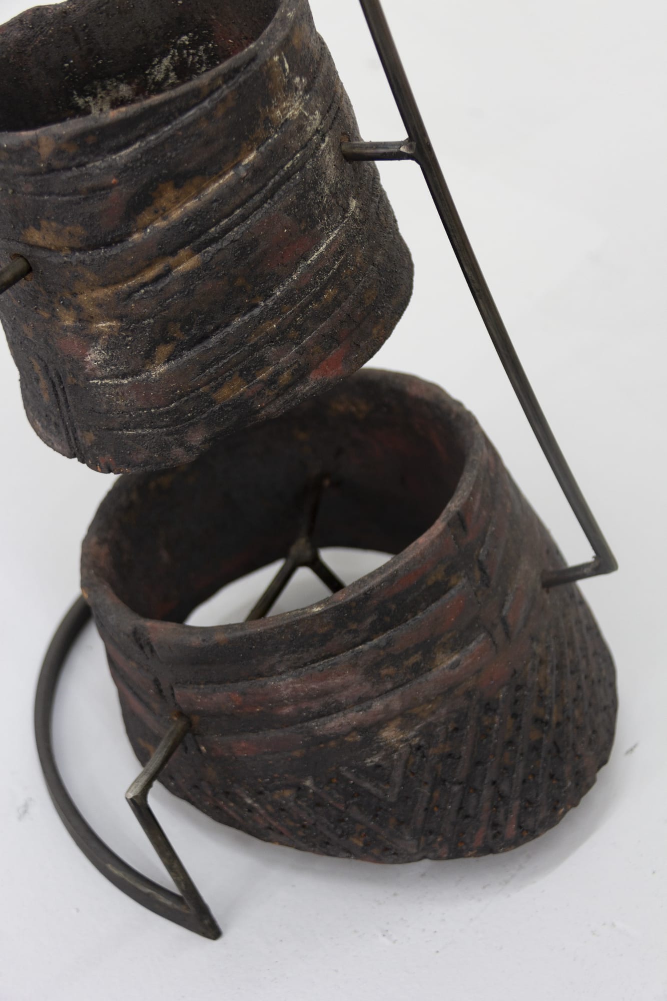 red oxide impregnated zacatecas stoneware with copper and oxide patina, blackened steel