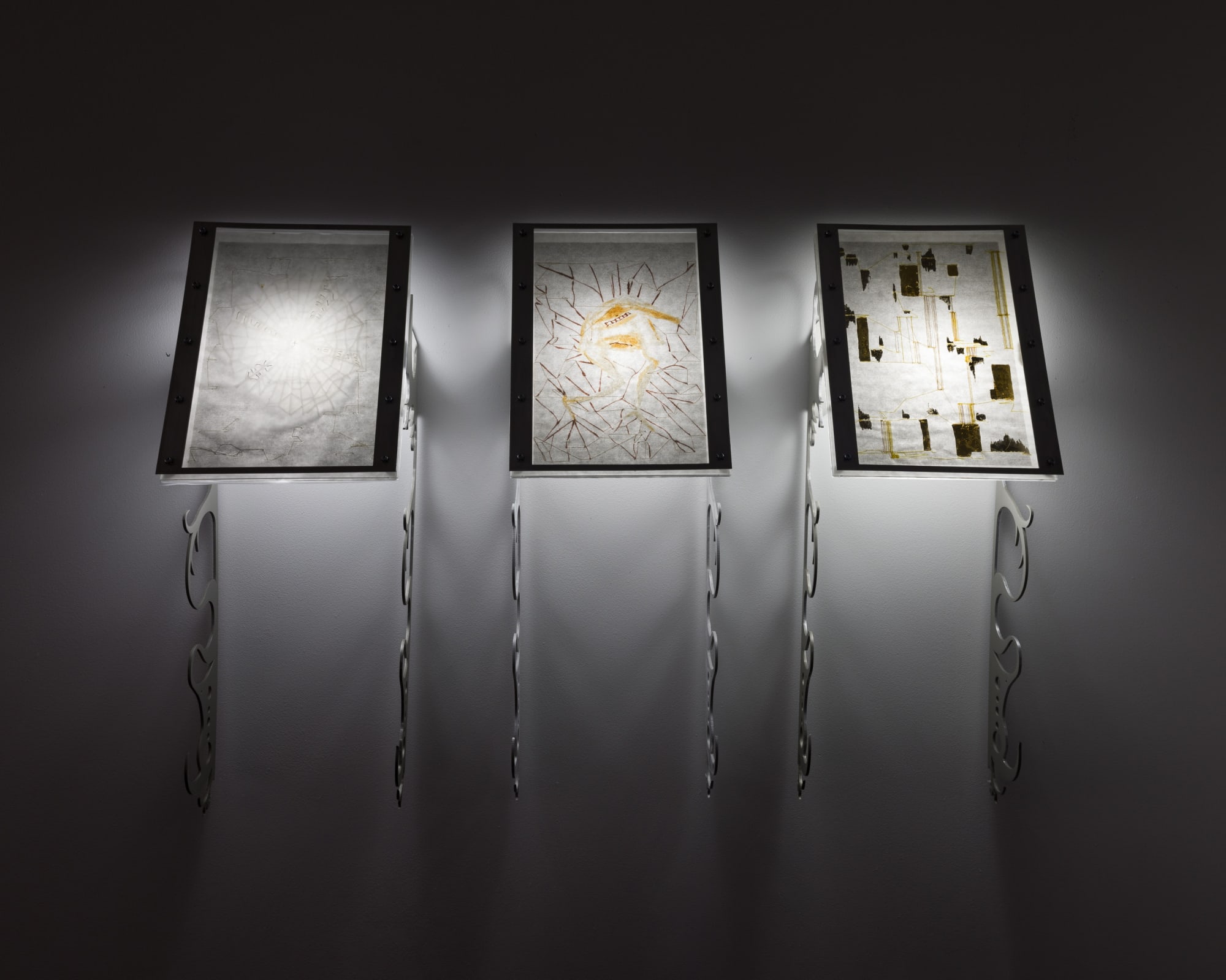 Artist’s DNA data printed on rice paper, thread, acrylic, ink, aluminum, LED lights, latex, and steel