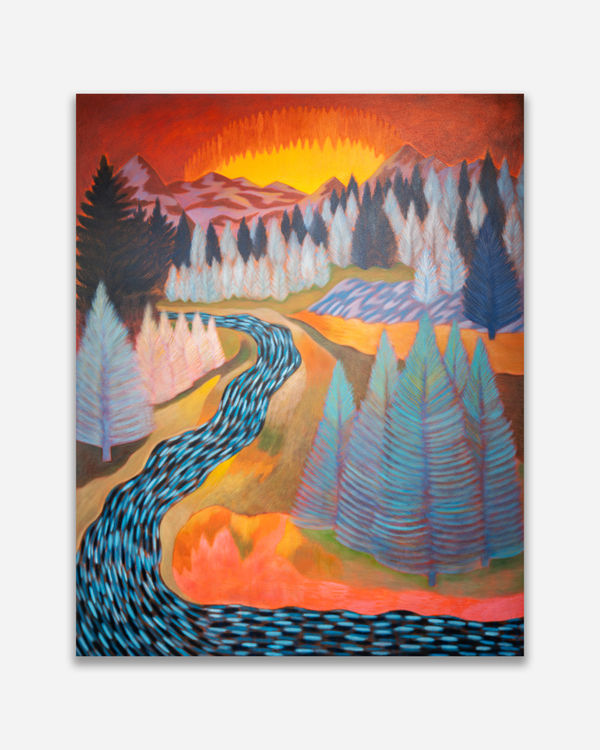 Inspired by the landscapes surrounding Los Angeles—the rolling hills, the desert’s quiet vastness, the shifting glow of the Pacific—her work transforms familiar terrain into something deeply felt rather than precisely rendered. The golden hues of dusk, the soft blue of early morning light, and the earthy warmth of canyon trails seep into her compositions. Trees sway in quiet rhythm, rivers ripple like whispered reflections, and mountains pulse with an inner glow, as if absorbing and radiating the sun’s final light.